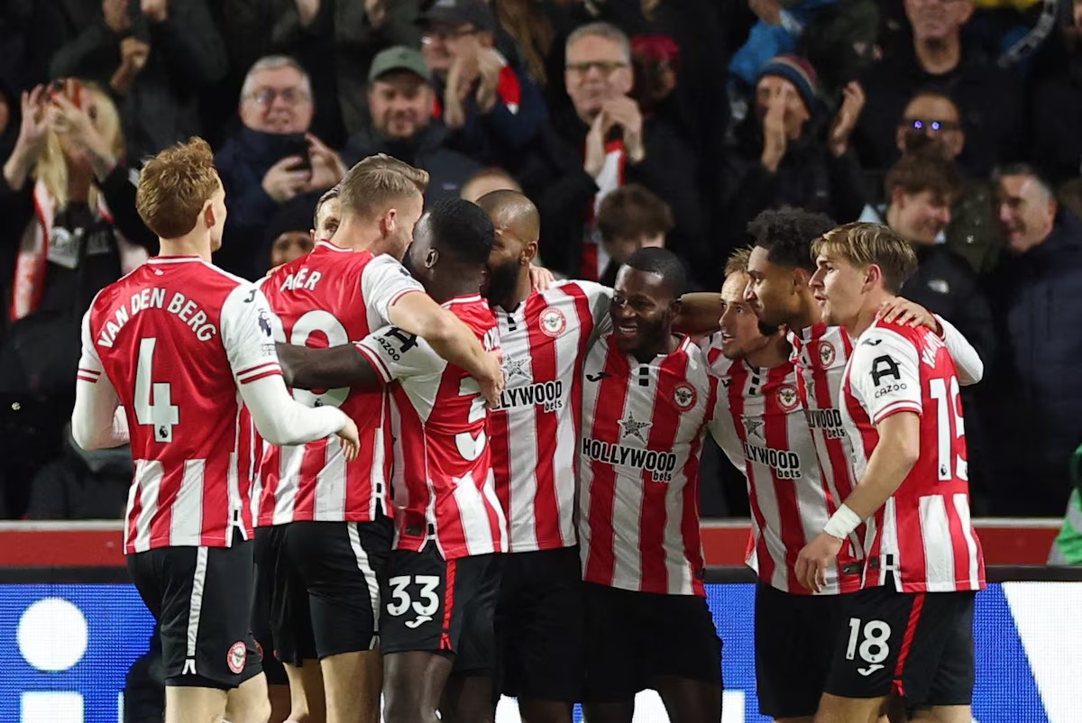 • واتارا لاعب برنتفورد يحتفل مع زملائه بتسجيله الهدف الأول في مرمى ليفربول