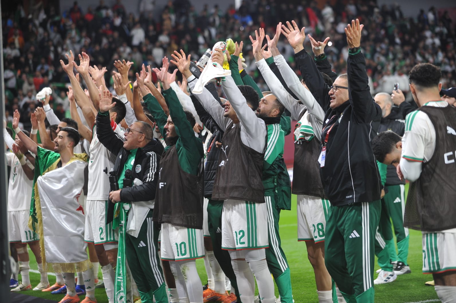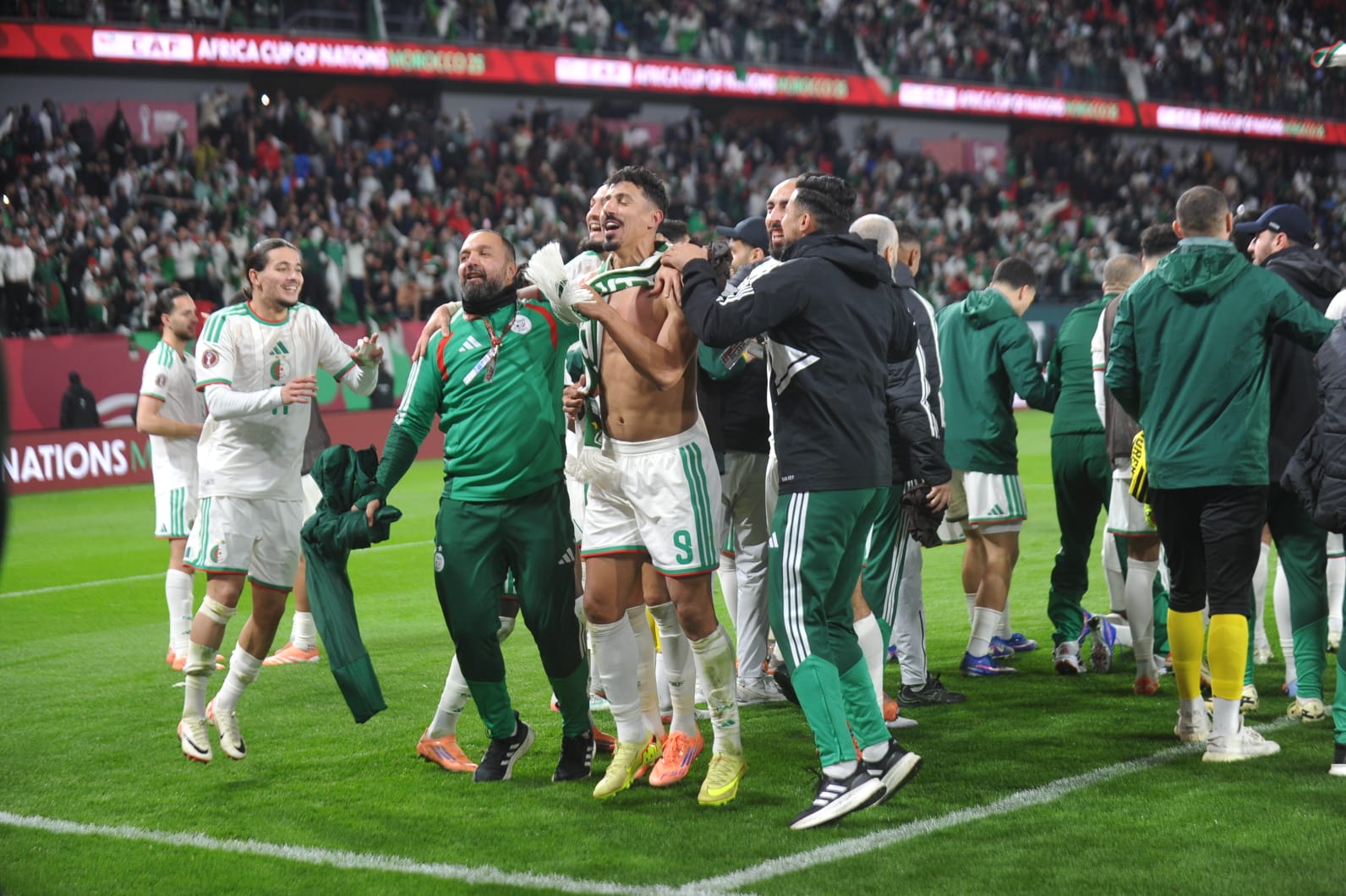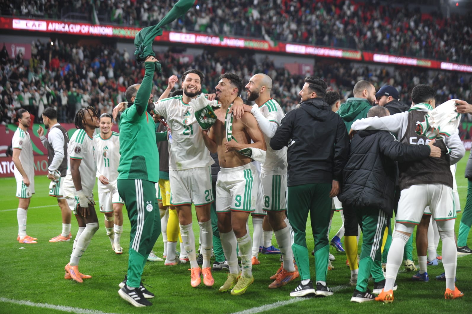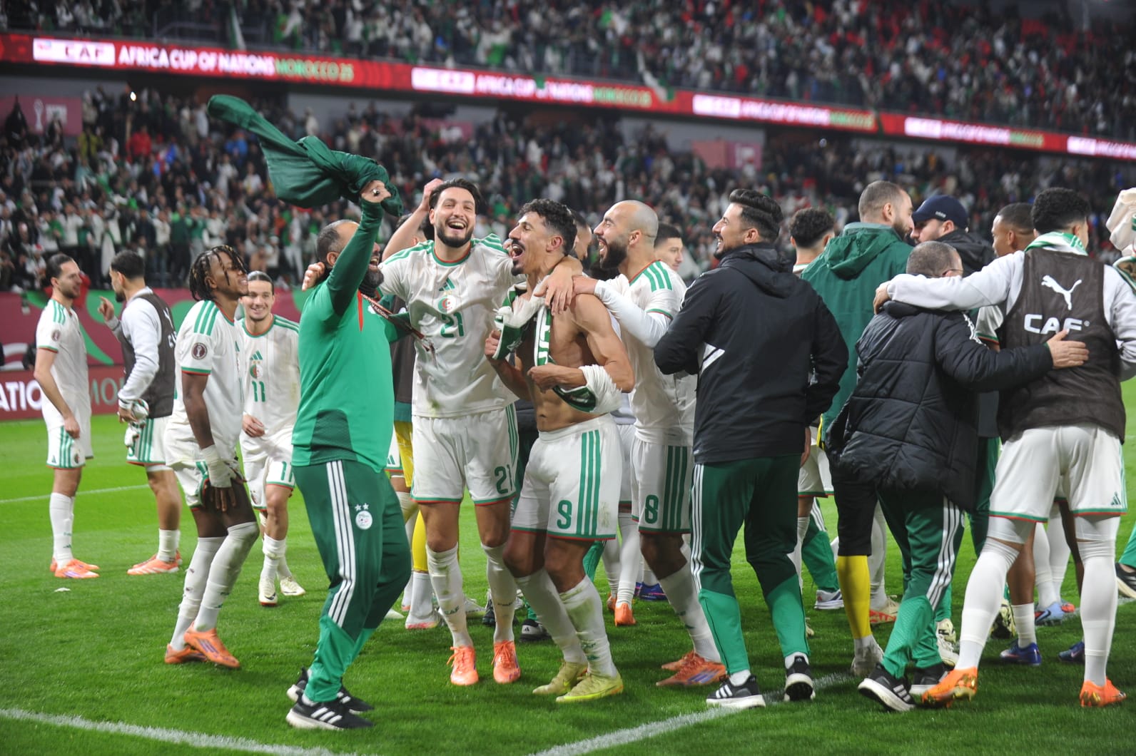 احتفالية لاعبي منتخب الجزائر بعد فوزهم على الكونغو الديموقراطية والصعود إلى ربع نهائي ال”كان”