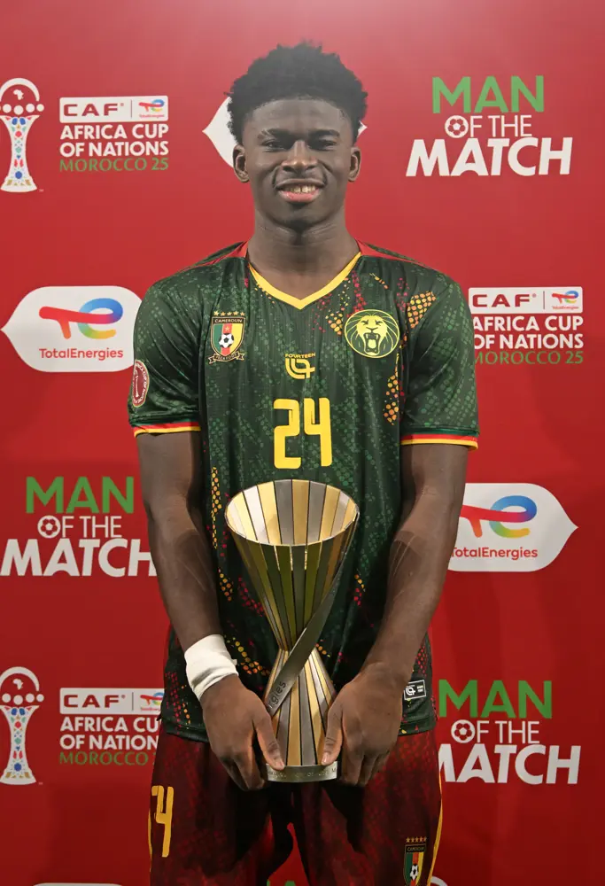 جائزة أفضل لاعب في المباراة (Player of the Match) توتال إنيرجيز، بعد تألقه في فوز منتخب الكاميرون على جنوب إفريقيا بنتيجة (2-1) ضمن دور الـ16 من كأس أمم إفريقيا، توتال إنيرجيز المغرب 2025.