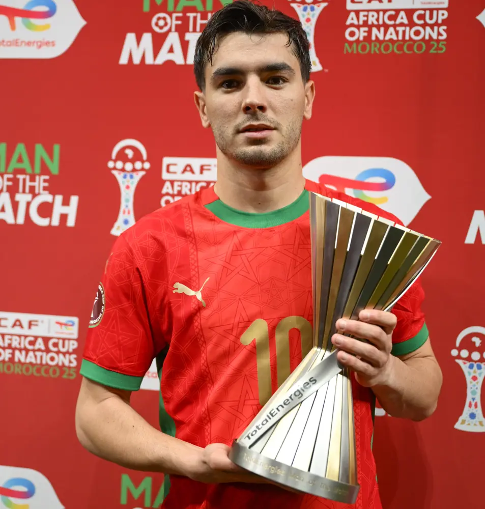 جائزة أفضل لاعب في المباراة (Player of the Match) توتال إنيرجيز، عقب تألقه اللافت في مواجهة فريقه أمام تونس ضمن دور الـ16 من كأس أمم إفريقيا، توتال إنيرجيز المغرب 2025.