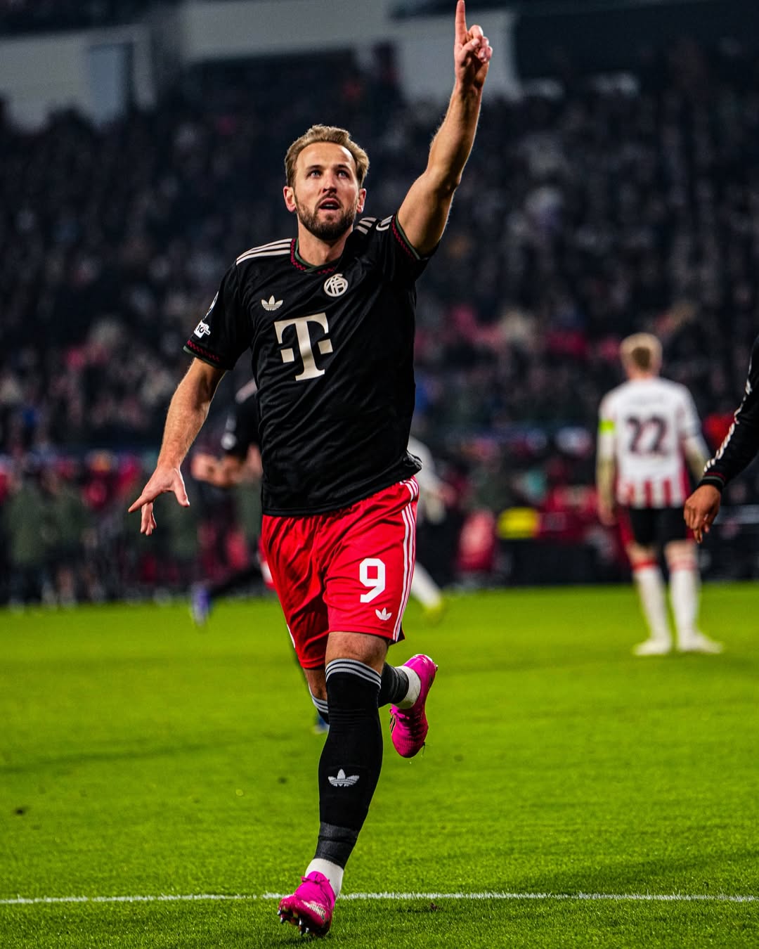هاري كين لاعب بايرن ميونخ يحتفل بتسجيل الهدف الثاني لفريقه في مرمى آيندهوفن