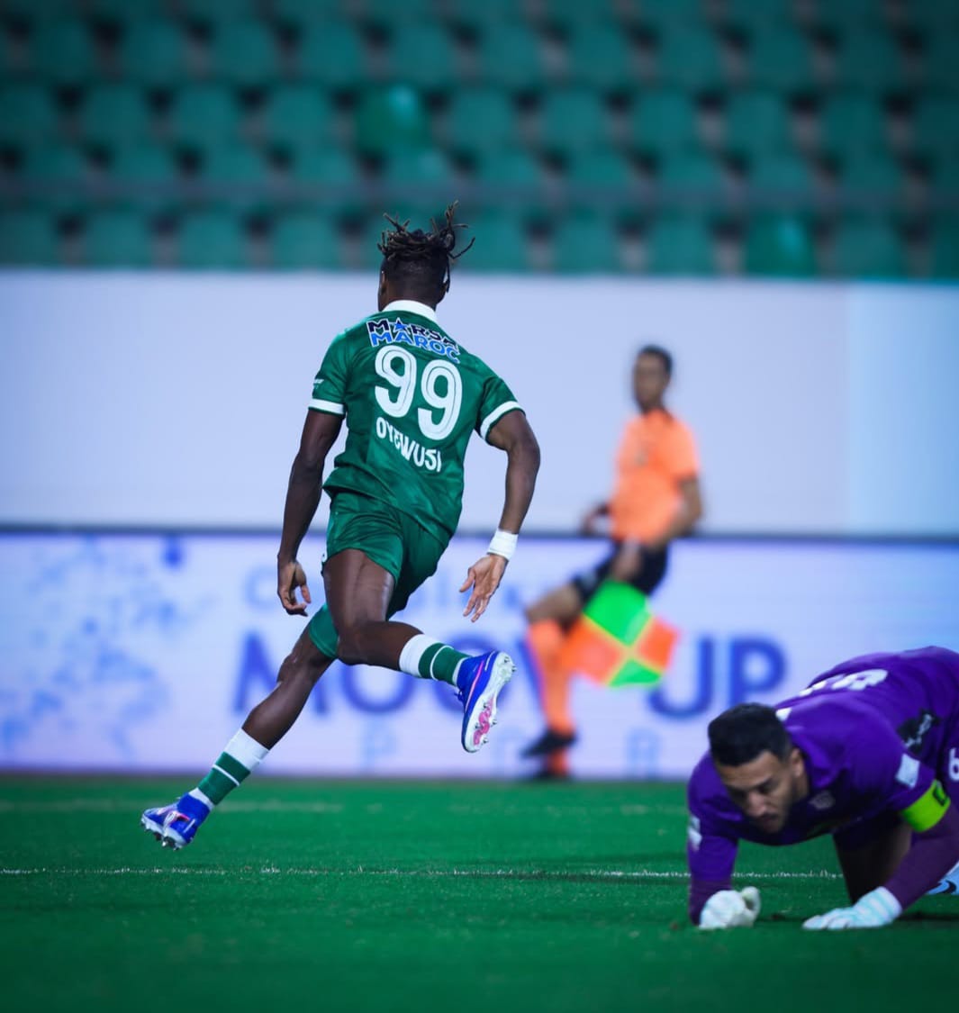 ماتياس أويوسي يحتفل بتسجيل هدف الرجاء الرياضي أمام حسنية أكادير في ملعب أدرار ضمن الجولة 14 من البطولة الاحترافية إنوي 1 يوم 1 مارس 2026