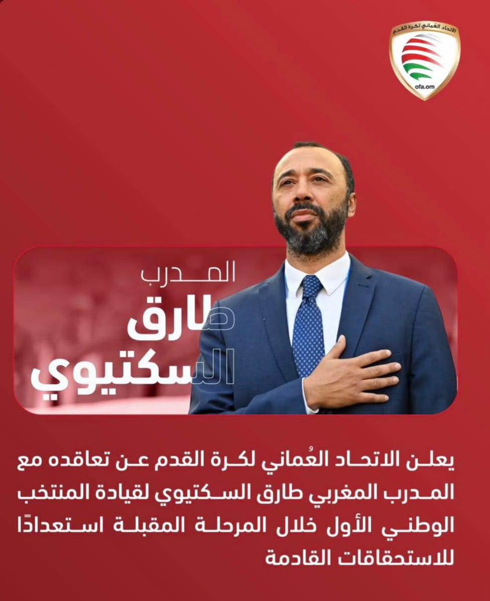 وقال الاتحاد العماني في بيان: “يعلن الاتحاد العُماني لكرة القدم عن تعاقده مع المدرب المغربي طارق السكتيوي لقيادة المنتخب الوطني الأول خلال المرحلة المقبلة”.
