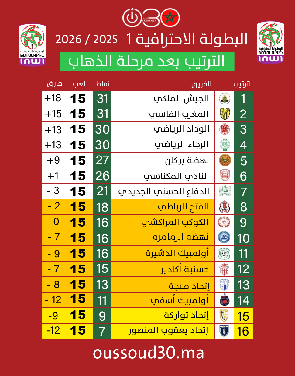 ترتيب البطولة الاحترافية إنوي 1 بعد نهاية مرحلة الذهاب 2025-2026 مع صدارة مشتركة بين الجيش الملكي والمغرب الفاسي وصراع قوي على اللقب